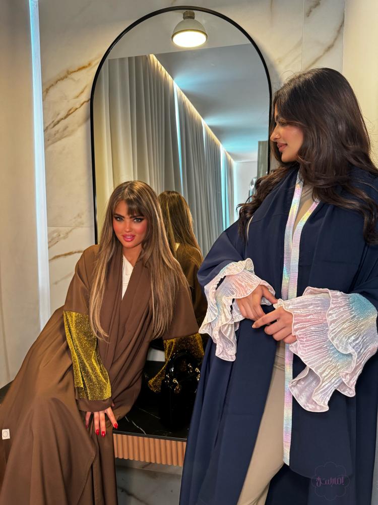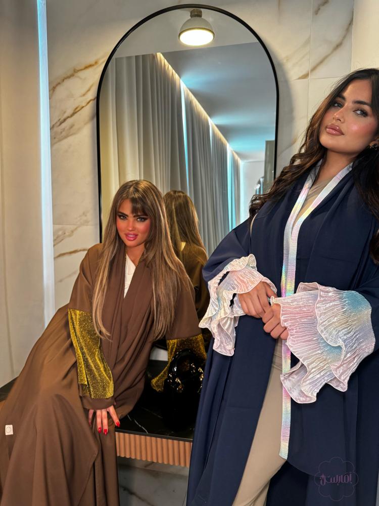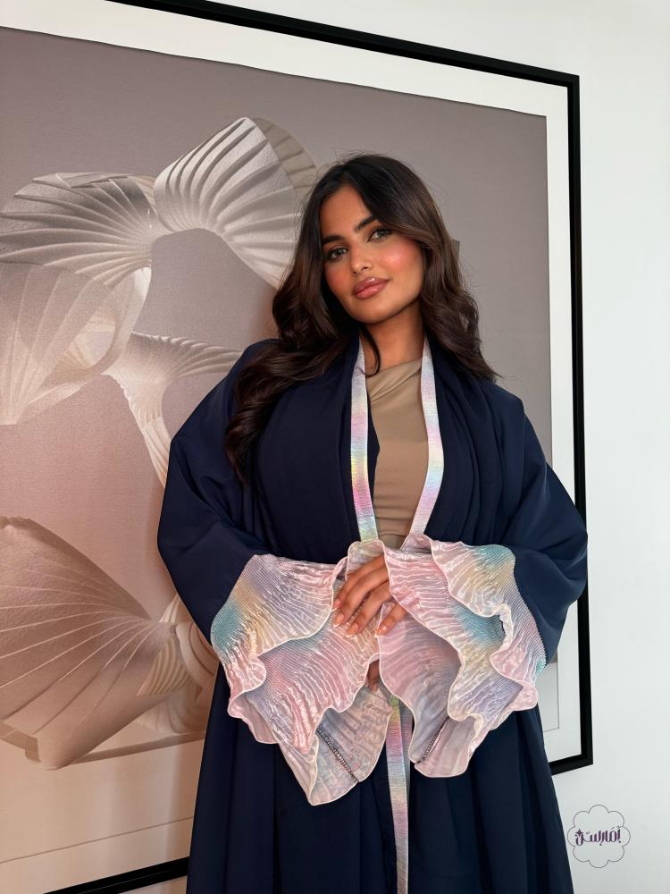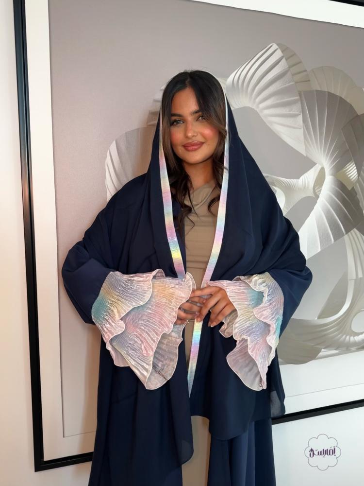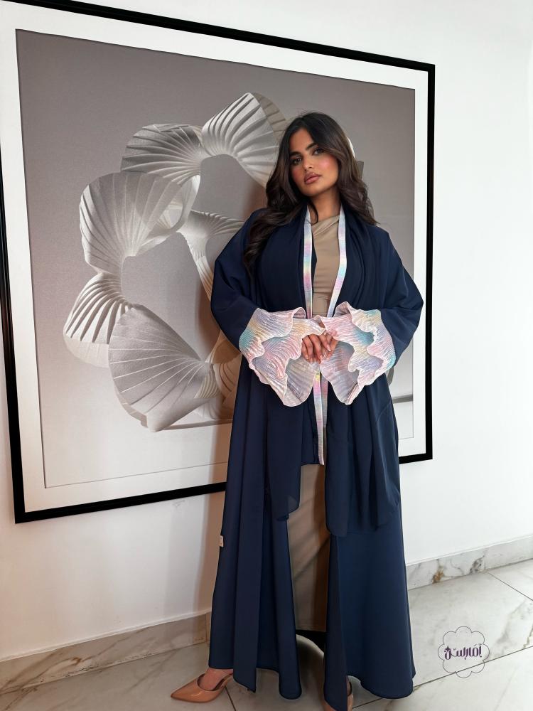 قماش باربي كحلي مع اكمام مكسره ملونه طرف طرحه ملون "قماش طرق الطرحه مختلف عن قماش الكم لكن نفس الالوان"